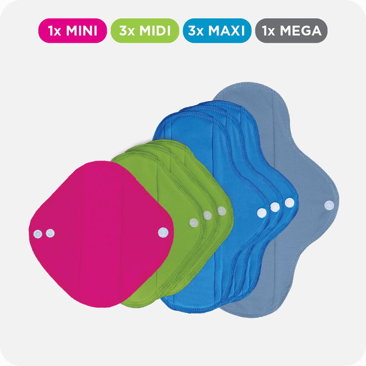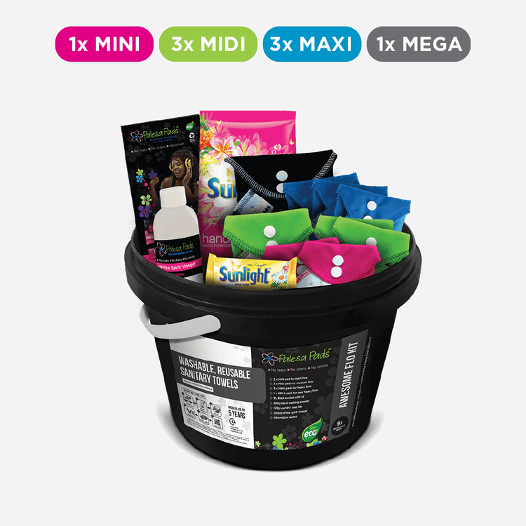 Flo Kit including 10 reusable sanitary pads and a cleaning kit.